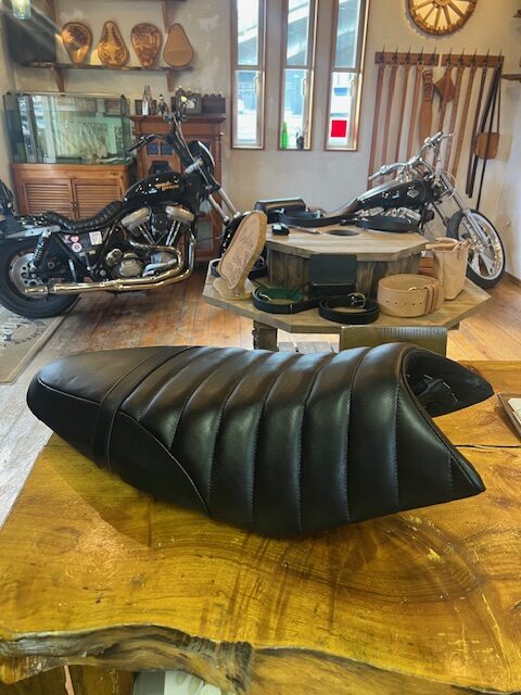 未分類 オーダーシート 05/06/2025 オーダー頂いたバイク用シート本革張り 素材、色、アンコ形状を打ち合わせ後作業に入ります 今回のオーダー内容は、 アンコ形状はそのままでタックロール(幅も指定)、切り返しデザインをご指定 既存のビニールを取り除き、センターを出してから片側のみカットラインを決める その後、型を起こし一気に裁断 タックロール配置バランスを考... LEATHER WOLF